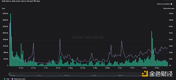 以下是過去 180 天內 Optimism 的每日費用(綠色)和每日活躍用戶(紫色):