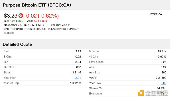 在 Grayscale 爭取能夠通過 ETF 審批的同時,比特幣 ETF 本身可能已經成為偽命題。以北美首只通過的 Purpose Bitcoin ETF 為例,目前的市值只有 1.13 億美元,一天的成交金額約 30 萬美元。