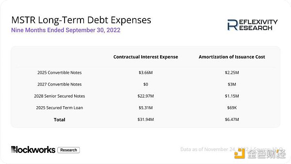 在截至 2022 年 9 月 30 日的九個月里,MSTR 所有值得注意的未償還長期債務的合同利息支出和攤銷的發行成本可以在下表中找到。在這九個月中,Microstrategy 為以下四種債務工具支付了大約 2200 萬美元。