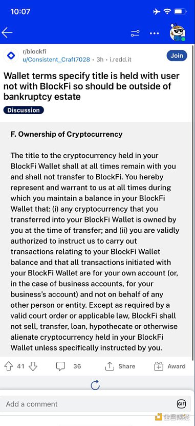 你的BlockFi錢包持有的加密貨幣的所有權應始終為你所有,不得轉讓給BlockFi。在此你向我們聲明并保證,在你的BlockFi錢包持有余額的任何時候:(1)你轉移到你的BlockFi錢包中的任何加密貨幣在轉移時為你所有;(2)你經有效授權指示我們進行與你的BlockFi錢包余額有關交易,及通過你的BlockFi錢包發起的所有交易均由你本人負責(或,在企業賬戶情況下,由你的企業負責),而不代表任何其他人或實體。除依有效法院命令或適用法律要求外,除非你明確指示,否則BlockFi不得出售、轉讓、貸款、抵押或以其他任何方式轉讓你的BlockFi錢包中持有的加密貨幣。)