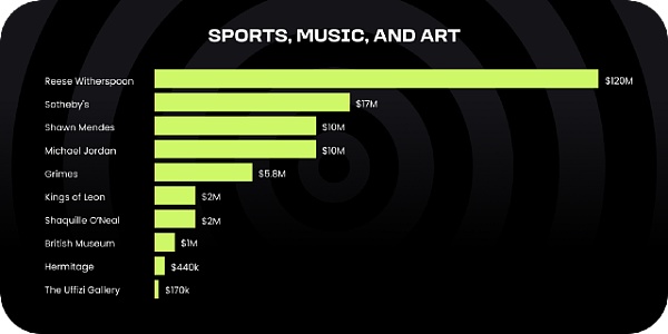 本組行業專注于獨家訪問內容以及數字收藏品。個人或企業包括《時代雜志》、《福布斯》、Netflix、滾石樂隊、歌手肖恩·門德斯、歌手格萊姆斯、著名導演昆汀·塔倫蒂諾等。