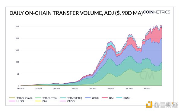 衡量采用情況的一個簡單標準是鏈上轉移的價值。使用相對較長的 90 天移動平均值窗口,每天在區塊鏈上與穩定幣交換的價值接近歷史高點,每天 250 億美元。其中約 200 億美元來自 USDC(以太坊上)和 Tether(以太坊和 Tron)的轉移。