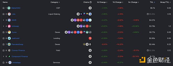 DeFi項目鎖定資產前十排名及鎖倉量 數據來源:defillama