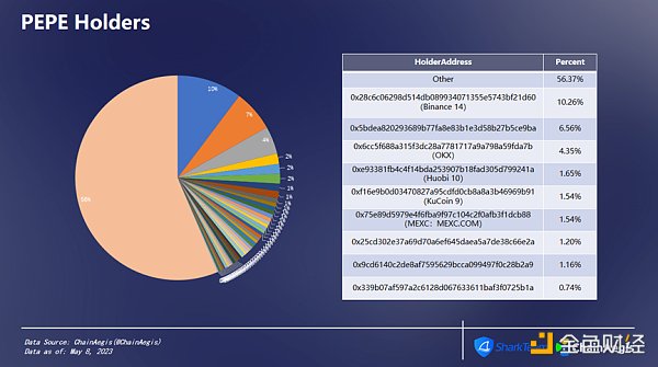 5月5日,PEPE在幣安上線,僅僅3天時間,幣安的熱錢包地址已成為持有PEPE最大的地址,占PEPE總代幣的10.26%,OKX占6.56%。PEPE持有者共有107,972個,持幣者占比相對分散,集中度較小。