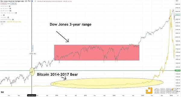 2013 的牛市許多人還記憶猶新,但隨后比特幣便進入了 2014-2016 年的漫長熊市。在此期間,道瓊斯指數也在 15, 400 和 18, 300 之間的范圍內徘徊震蕩,而且出現了三次較大幅度的下跌(參見下圖紅框范圍)。
