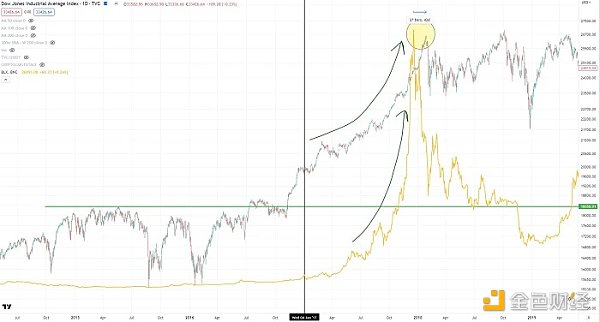 當時間來到一年之后的 2017 年,比特幣價格和道瓊斯工業平均指數的拋物線走勢愈發相似,盡管這種同步趨勢當時只維持了大約 42 天。