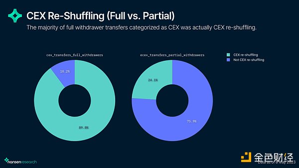 當將 CEX 轉賬分解為完全完全取款和部分取款時,對于完全提取,CEX 重新洗牌的 CEX 轉賬百分比要比部分提取大得多。具體來說,來自全額提款的 83.1% 的 CEX 轉賬中有 89.8% 實際上是 CEX 重新洗牌,而來自部分提款的 23.7% 的 CEX 轉賬中只有 24.1% 是 CEX 重新洗牌。