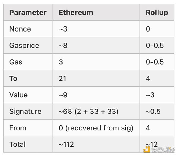 就這么三兩下,每條 ETH 轉賬交易的大小就由 112 字節,縮減為 12 字節,接近以前的十分之一;當然,還有其他手段,可以進一步壓縮交易數據。