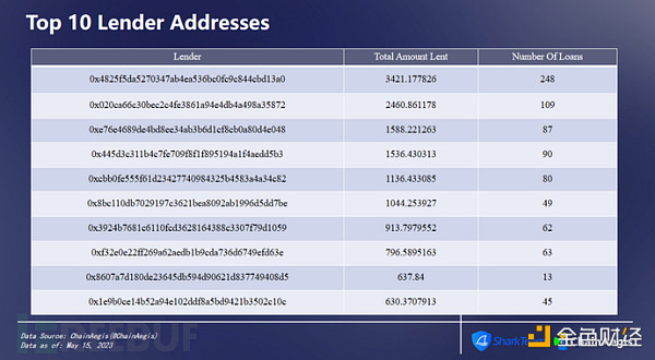 以下為按貸款總額排名的TOP 10貸款人地址信息。截止到5月15日,地址0x048...13a0累積貸款3,421.17 ETH,位居第一。地址0x020...5872累積貸款2,460.86 ETH,位居第二,值得一提的是,該地址為此前聲稱要推出NFT圈的黃立成地址(以太坊域名:machibigbrother.eth)。