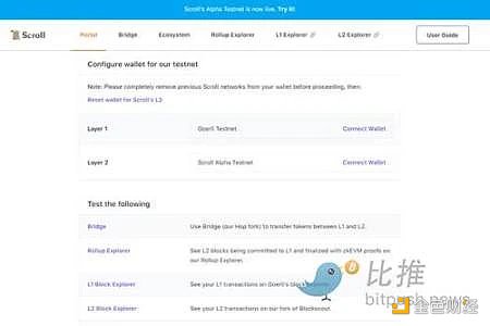 2023 年 2 月,Scroll 團隊啟動了其 zkEVM 的 Alpha 測試網。要試用測試網,可以訪問 https://scroll.io/alpha 并使用提供的「連接錢包」按鈕將對 Scroll 的支持添加到您的錢包。完成后,您可以測試通過 Scroll Bridge 發送 Goerli ETH ,這是 Hop 的一個分支。