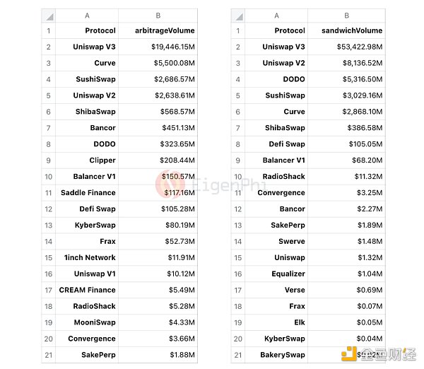 Uniswap V3 是套利機器人和三明治機器人最受歡迎的協議,二者的總交易量為 728 億美元,與套利交易量相比,Uniswap V3 的三明治交易量高出一個數量級。對 DODO、Uniswap V3 等協議來說,三明治交易量幾乎占了總交易量的一半,值得用戶考慮。