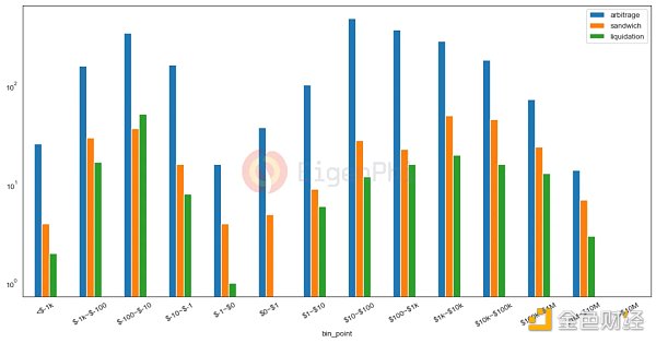 總體來說,套利搜索者產生的收入在 1 月、 5 月、 6 月與 11 月相對較高,其余月份則表現穩定。除 11 月,三明治機器人的收入在第三、四季度均呈下降趨勢。清算交易產生的月度收入中, 5 月、 6 月、 11 月的收入明顯高于其他月份,因為 ETH 在 5 月、 6 月的大幅下跌與 CRV 空頭擠壓事件導致了清算機會。
