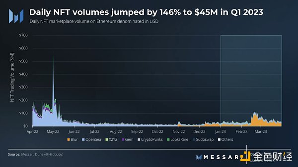 2023年第一季度,每日NFT交易量激增146%,達到4500萬美元。Blur空投活動后,活動明顯增加。Blur以每日2900萬美元的交易量領跑NFT交易量占比,達到64%。其次是OpenSea,每日交易量為1100萬美元,交易量占比為25%。
