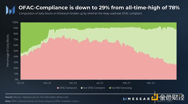 在 2022 年第四季度,當時對審查的擔憂達到歷史最高點時,我們就認為以太坊的審查擔憂被過分夸大了。時間證明這是正確的。本季度末,使用審查中繼器的驗證者比例僅為 29%,低于本季度初的 61%。任何受美國外國資產控制辦公室(OFAC)制裁的地址都可以在 3 個區塊中的 2 個區塊中包含交易。以太坊仍然是一個中立的基礎層。