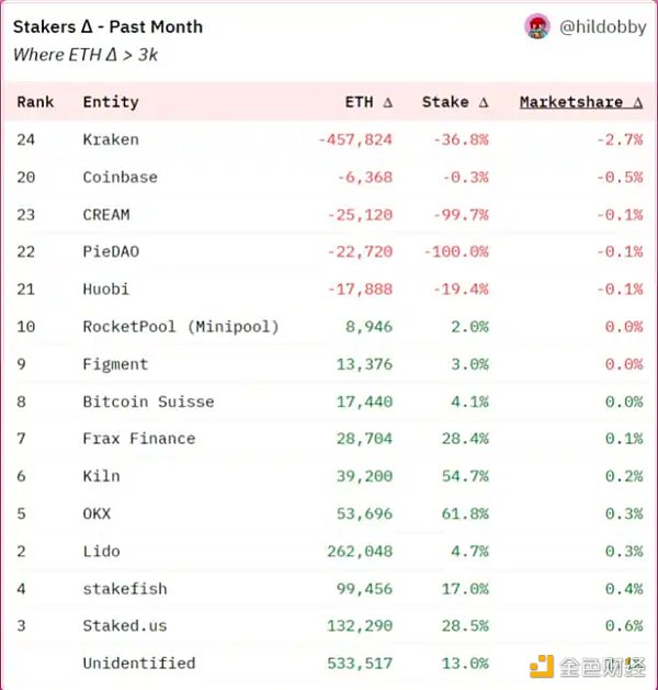 這正是正在發生的事情——在過去的一個月中,Kraken、Coinbase 和火幣失去了市場份額。實際上,所有 ETH 質押提款的 36% 都來自 Kraken。