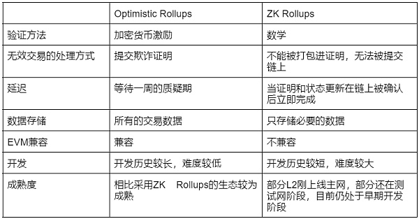 L2 Rollups 除了 ZK Rollups,還有Optimistic Rollups。以下是兩種方案的對比。
