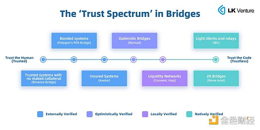 當前主流跨鏈項目為了避免高昂的鏈上輕節點成本,將驗證過程移至鏈下,同時也帶來不同程度的信任假設和潛在欺詐風險,LK Venture投研團隊根據信任程度從高到低,對部分重點方案進行介紹。