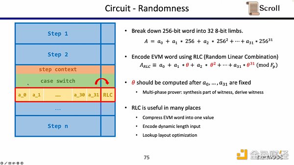 首先是電路中的隨機性,因為 EVM 字段是256位,我們需要將其拆分成 32 個 8 位的字段,從而更高效得進行范圍證明。隨后我們使用隨機線性組合(Random Linear Combination, RLC)的方法,利用隨機數將32個字段編碼成1個,只需要驗證該字段就可以驗證原始的256位字段。但是問題在于隨機數的生成需要在拆分字段之后,才能確保不被篡改。因此 Scroll 和 PSE 團隊提出了多階段證明者的方案,來確保在字段拆分之后,再利用隨機數生成RLC,該方案被封裝在了 Challenge API 中。RLC在zkEVM中有許多應用場景,不僅可以壓縮EVM字段成一個字段,也可以加密不定長的輸入,或是優化查找表的布局,但仍然有許多開放性的問題需要解決。