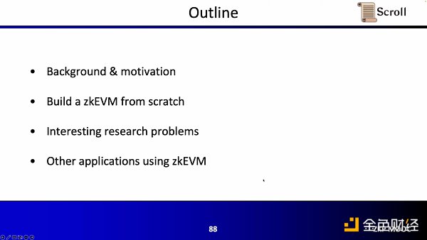 第三部分,張燁談論了一些Scroll 在構建 zkEVM 過程中有趣的研究問題,從前端的算術化電路到證明者的實現。