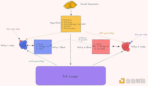Shared Sequencer 集是一個匯總網絡,它聚合和排序多個匯總的交易。這些匯總都共享相同的排序器。這種資源匯集意味著 rollup 獲得更強的經濟安全和審查阻力,從而允許快速的軟最終保證和有條件的交叉 rollup 交易。