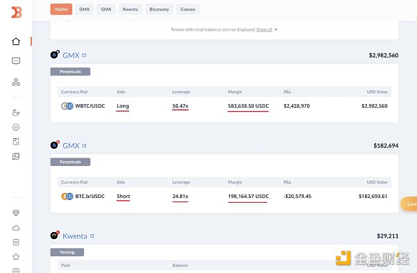 深入調查他的 DeFi 交易,我們可以發現他似乎鐘愛 GMX 協議,將大部分資金質押在 GMX 中,并賺取收益: