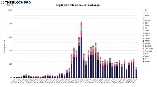 6、合規中心化交易所(CEX)的現貨交易額在四月份下降了43.8%,達到約4005億美元,之所以會出現如此大幅度的下跌,很大程度上是因為幣安恢復收取比特幣交易對費用。