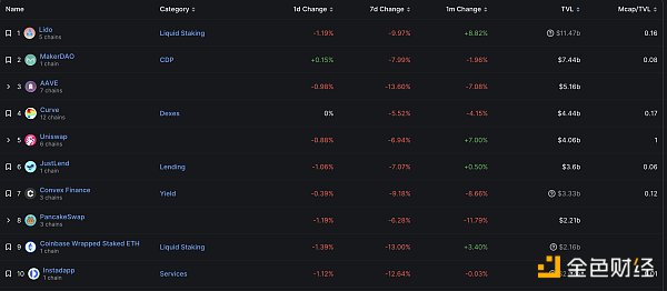 DeFi項目鎖定資產前十排名及鎖倉量 數據來源:defillama