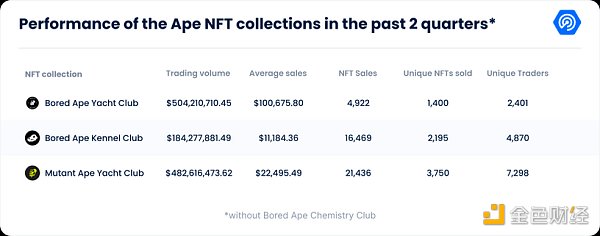 在過去的兩個季度里,BAYC 一直保持著在所有 NFT 項目中最高的交易量,平均售價為 100,675 美元。該 NFT 的交易者平均交易 3.52 筆。