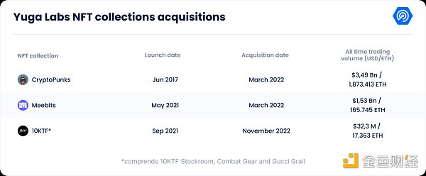 自從收購了 CryptoPunks 和 Meebits 之后,Yuga Labs 不斷在 NFT 行業進行戰略布局。2022 年 11 月,收購 WENEW 及其旗艦 NFT 系列 10KTF,推動 Yuga Labs 進軍時尚行業。2023 年第一季度,10KTF 占整個 NFT 時尚收藏品交易量的 74%。