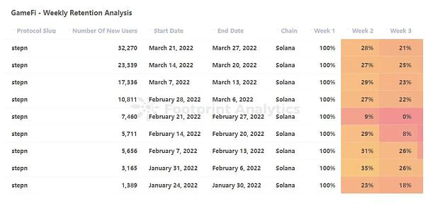 在 2022 年 3 月的活躍期間,STEPN 的周留存率能夠達到 30% 以上。這是因為 STEPN 非常重視建立社區文化和價值觀,吸引了有強烈社交屬性和互動需求的用戶。