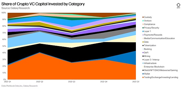當在 2023 年第一季度按融資階段評估時,VC 的活動看起來更加清晰(種子前、種子、早期、后期)。在后期階段公司完成的融資中,“挖礦”類別占比最大,而包括節點托管和質押服務在內的“基礎設施”類別在早期階段公司完成的融資中占比最大。