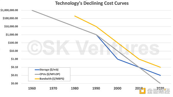 每一次的崩潰都產生了更為廣泛的后果。CPU 價格的暴跌直接將我們從大型機拽進了個人電腦時代;(各種類型)存儲價格的崩潰不可避免地導致更多帶有可觀本地存儲的個人計算機的出現,從而幫助催生了數據庫和電子表格,然后導致了 web 服務,接著是云服務。而且,最近,(隨著帶寬的爆發式增長)網絡傳輸成本的崩潰直接導致了現代互聯網、流媒體視頻以及移動 app 的出現。