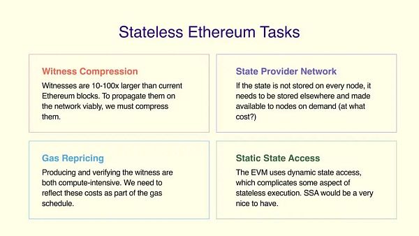 而實現無狀態以太坊要完成四件事:壓縮區塊見證數據、形成狀態提供者網絡、交易的 Gas 耗用量重定價、實現狀態的靜態訪問模式。