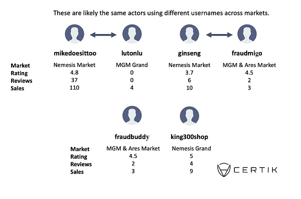 在檢查這些廣告時,我們還可以看出它們絕大多數是來自同一供應商。在我們對上述三大市場的檢查中,還發現了有六個供應商擁有獨特的用戶名。然而,這些廣告的內容表明這些所有的內容中,只有四個(不重復的)演員,其中兩個在不同市場使用了不同的用戶名。(基于這些廣告的內容是逐字逐句完全相同的)。下面是這些演員的名單,以及他們在Nemesis、MGM Grand和Ares市場的相關供應商統計。