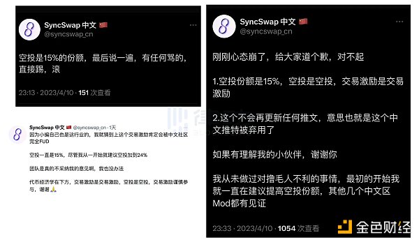 SyncSwap 的社區討論風波的源頭是 SyncSwap 社交媒體中文區的幾次發文。在最近的一次發文里,SyncSwap 中文道歉稱:「空投份額 15% ,空投是空投,空投激勵是空投激勵」,且表示該社交媒體賬號已被 SyncSwap 賬號棄用。