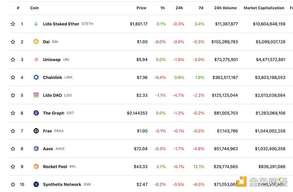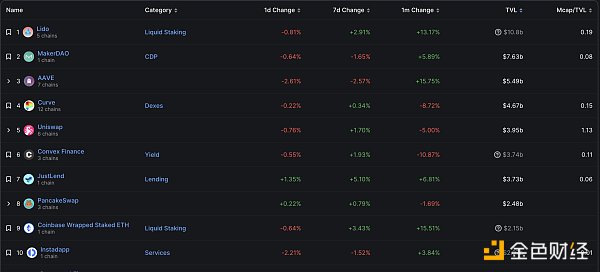 DeFi項目鎖定資產前十排名及鎖倉量 數據來源:defillama