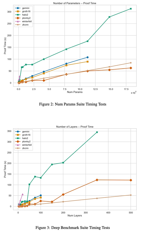 基于以上zk算法,modulus lab分別從時間消耗和內存占用兩個維度出發進行測試,并且在這兩個維度中分別控制了參數和層數兩個核心變量。以下是benchmark suites,這樣的設計也可以大致覆蓋從LeNet5的60k參數量,0.5MFLOPs,到ResNet-34的22M參數量, 3.77 GFLOPs。