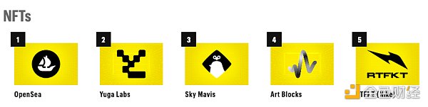 NFT:此類別選取領先的 NFT 市場和收藏品公司。選取標準包括市場費用(如適用)以及歷史交易量。