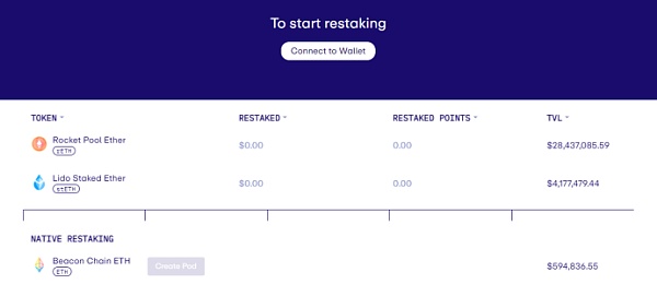 目前,第一階段測試網為質押用戶開放了兩種再質押方式,分別是 LSD再質押(透過 Lido、Rocket Pool 等 LSD 協議進行質押的用戶選擇此方式)和 Native 再質押(未透過 LSD 協議自己質押 ETH 的用戶選擇此方式)。