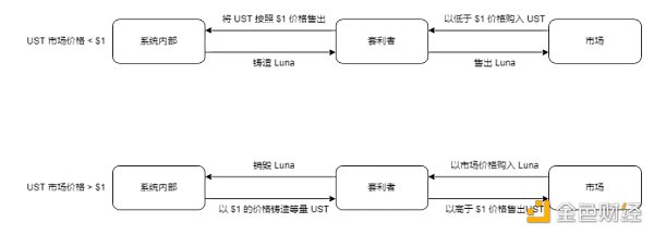 Terra 的穩定機制如下圖所示。Terra 通過其內部的預言機系統提供報價,在預言機內部, UST 的價格恒定為 $ 1 不變,當市場上的UST 過多時, UST 的市場價格小于 $ 1 ,套利者會在市場上購入 UST,在協議中以 $ 1 的價格售出,同時協議按照 Luna 的市場價格鑄造出等值的 Luna,套利者在市場中售出 Luna,完成套利。在這個過程中, UST 的流通量會通過套利機制逐漸減少, Luna 的價格會暫時下降。反之同理。
