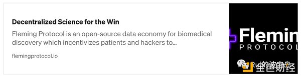 Fleming Protocol 是一種開源數據經濟,旨在通過激勵患者來推動協作式生物醫學,主要關注健康數據所有權。他們為患者提供了將數據存儲在 IPFS 中的基礎設施,確保他們保持完全的保管和控制。此外,它使患者用戶能夠將他們的數據貨幣化,能直接獲得數據變現的收益,其中一部分交易費用將貢獻給 FlemingDAO 國庫。