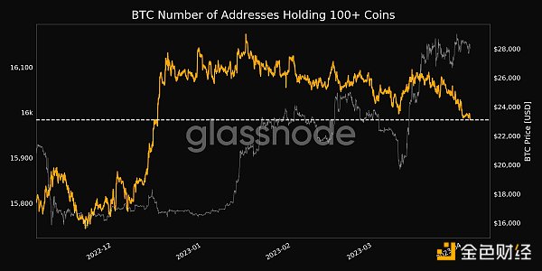 根據 Glassnode 的數據,鯨魚地址的行為暗示其并不像其他持有者那樣對比特幣持樂觀態度。持有超過 100 BTC 的地址數量開始下降。截至發稿時,該數據觸及 3 個月低點,進一步表明市場鯨魚的懷疑態度。
