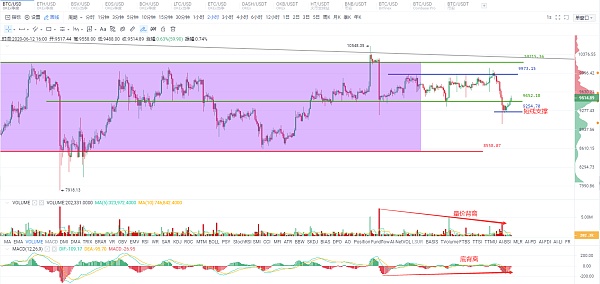 接下來的行情該如何應對呢?我的看法是,一直強調的9450短期走勢關鍵支撐被下破,也就意味著短期偏多頭格局被破壞,那么短期理應繼續看空后市。但是昨晚的下跌直接跌到9000一線,距離我們強調的中線關鍵支撐8550一線已經較近,市場過快的消化了短期拋壓。于此同時,如上圖所示,幣價這輪創新低時MACD指標明顯沒有同步創新低,形成了底背離,成交量指標亦是如此,說明這輪下跌的內在動力是不足的(主動性賣盤的缺乏持續性),從而導致幣價出現反彈。不過這個反彈力度超預期,已經再次站上9450,那么短期幣價繼續延續調整的概率就大大降低。