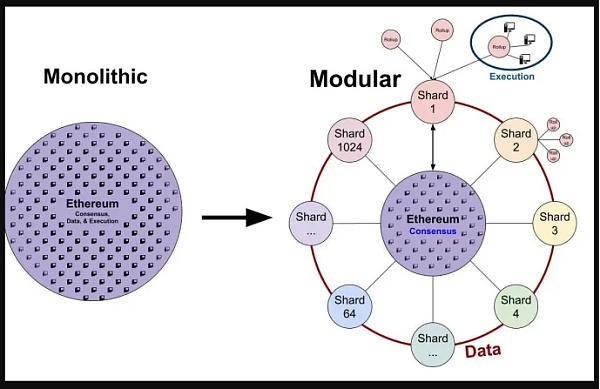 XRP/HKD+0.08%從區塊鏈層面出發,以太坊生命的初始階段是單一的(monolithic)。這意味著在最初的幾年里,Layer 1以太坊主網全權負責執行自己的交易,促進自己的網絡安全,并為自己的數據可用性提供服務。