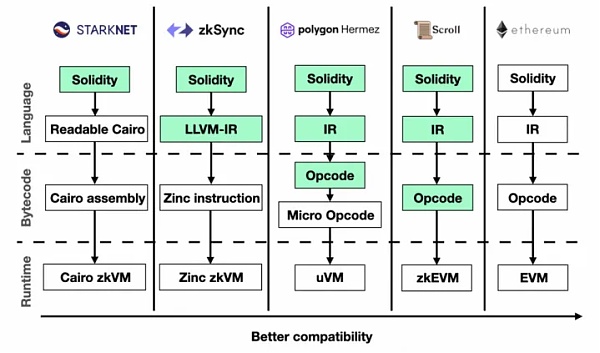 相比之下,ZK Rollup從定制的虛擬機(VM)開始,意味著項目需要進行大量的工作,即“解釋”來自 EVM 的代碼或使用從頭開始編寫的新代碼(截至2023年3月,多個ZK Rollup項目現在即將推出自己的zkEVM實現)。