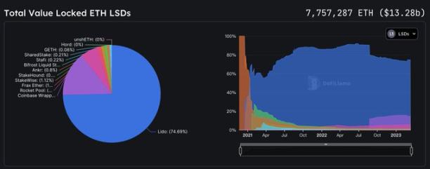 據 DefiLlama 相關數據顯示,流動質押 $ETH 的 TVL 已突破百億大關,達到 132.8 億美元 (7.75M ETH). $ETH 的流動質押比例 ( 流動質押資產總量 / 已質押資產總量 ) 為 42.9%。 ETH LSD 賽道衍生出了 10+ LSD 協議,其中僅 @LidoFinance 就蠶食了近 75% 的市場份額,具有明顯的馬太效應。