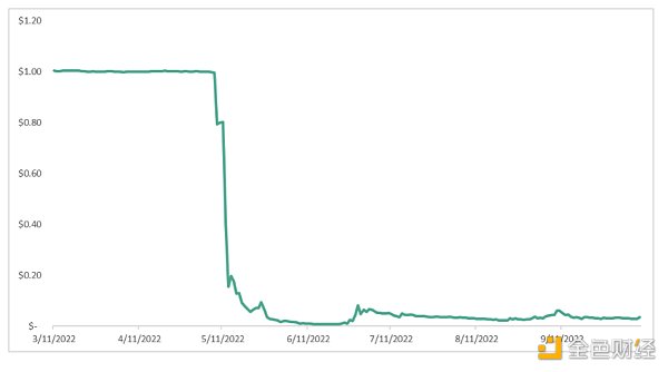 最終,市場和機制力量的共同作用終結了Terra項目。UST的價格在2022年5月暴跌,當時,UST資本外逃,流動性池失衡,Terra DeFi協議用戶大量流失,這些極大地拉低了UST的價格(見圖11)。更具體地說,當UST的交易價格低于1美元時,用戶利用這個機會以折扣價買入UST,然后再用它換取價值1美元的Luna,獲得適度利潤,隨后出售他們所持有的Luna。這一活動對UST和Luna都造成了拋售壓力。