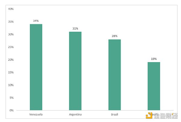 但穩定幣具有變革性的潛力,遠遠超出了交易應用層面。這些代幣可以不依靠當地銀行系統獲取美元——對于那些生活在高通脹環境下的人來說,穩定幣具有改變游戲規則的潛力。想想委內瑞拉和阿根廷這樣的國家吧,兩國公民分別面臨著114%和79%的驚人年通脹率。這相當于他們一生的積蓄在短短一年內就損失了近一半價值。穩定幣可能會為這些公民提供一個充滿前景的解決方案。通過為用戶提供一種可獲得且穩定的本地貨幣替代品,穩定幣可以使個人能夠保護自己免受通貨膨脹和貨幣貶值的影響。也許不出所料,穩定幣的使用率似乎與高通貨膨脹率呈正相關;2021年7月至2022年6月,委內瑞拉和阿根廷約三分之一的小型加密貨幣散戶交易是使用穩定幣進行的(見圖5)。
