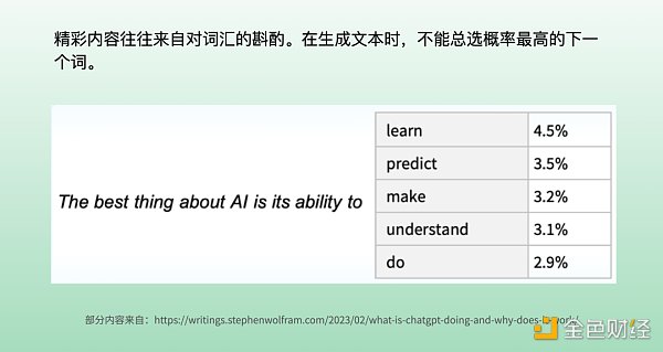 ChatGPT在生成文本時,是每次選擇一個詞,這個詞是在語言模型給出的概率表中做出的選擇。當前科研人員的發現是,如果每次都選擇概率最高的詞匯,理論上是最優解,最后呈現卻往往是一篇非常普通的文章;如果不是每次選擇最優解,例如隨機選擇排名稍微靠后一點的,卻有更大機會生成一篇精彩文章。這也是個有意思的未解之謎。