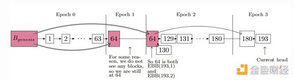 注意 Slot65 到 Slot128 沒有區塊。Epoch2 檢查點應該是 Slot128 上的區塊。由于缺少區塊,Epoch2 檢查點是仍然是 Slot64 上的區塊。Epoch 3 的情況類似,Slot192 是空的,因此前一個塊 Slot180 是 Epcoh3 檢查點。